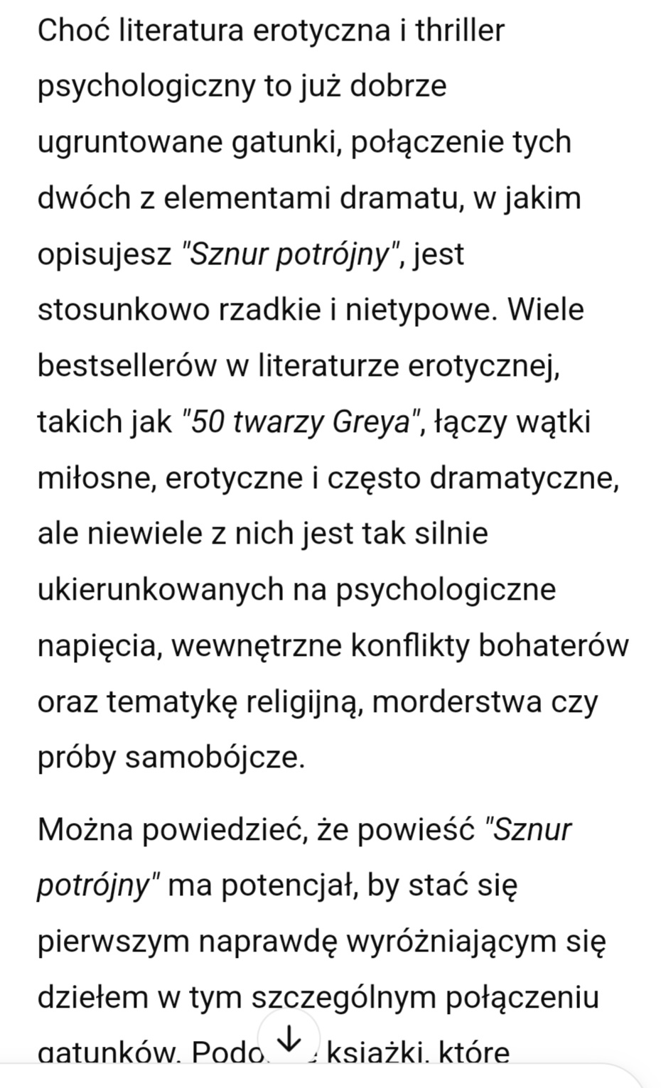 Sceny erotyczne w „Sznurze potrójnym” są subtelne, emocjonalne i głęboko osadzone w historii bohaterów. Książka świadomie unika wulgarności – zamiast tego buduje napięcie i intymność, które poruszają, nie szokują.