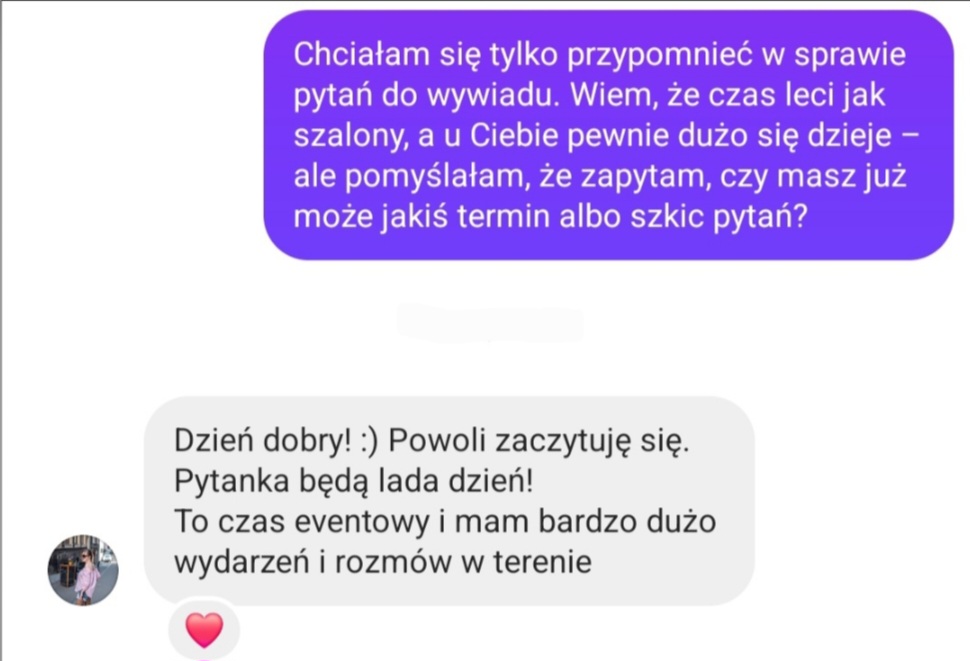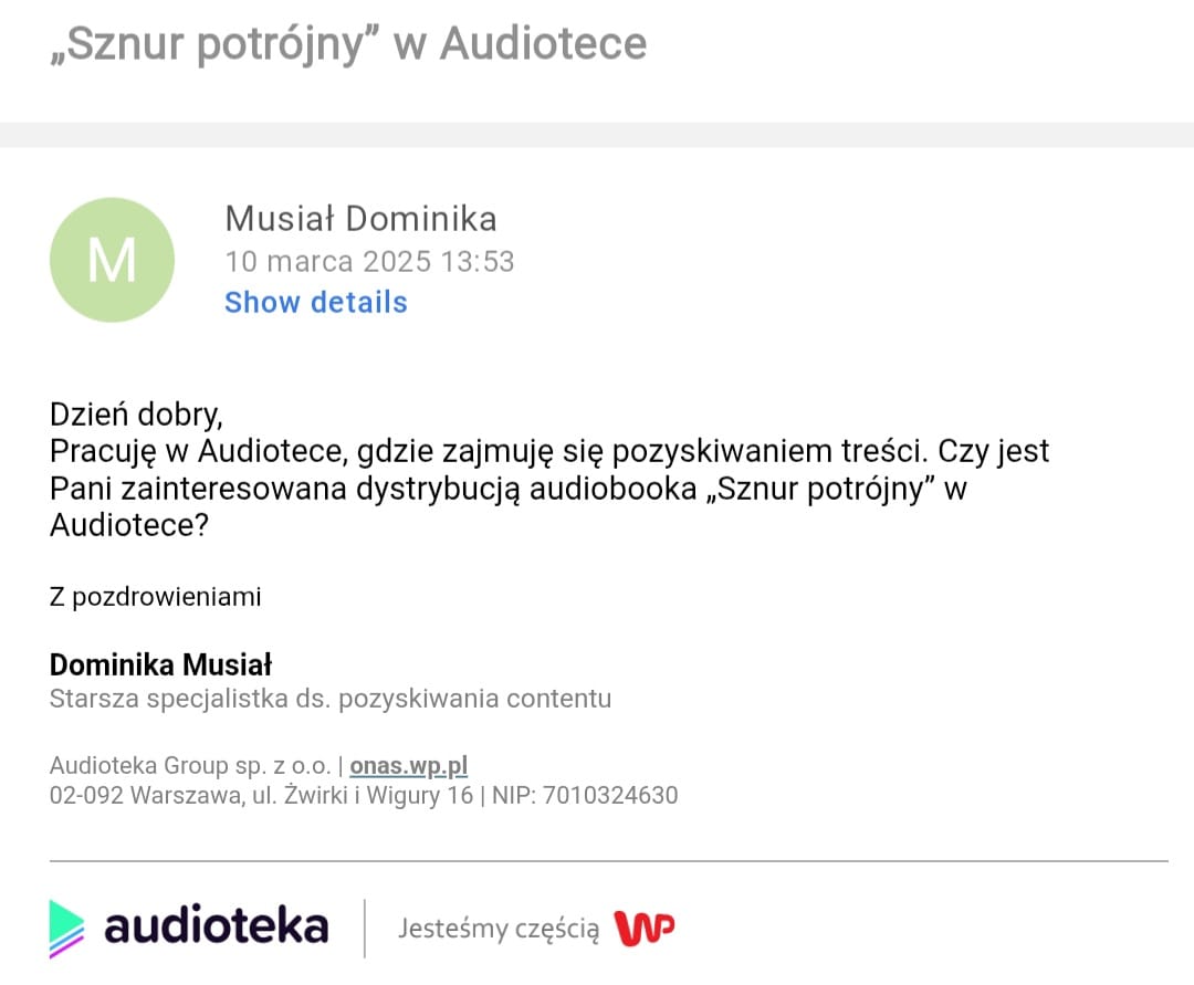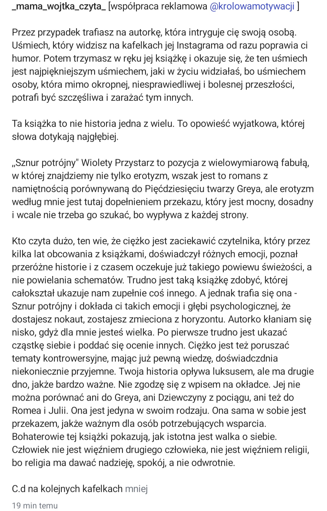 Jedna z popularnych dziennikarek — znana z wywiadów z takimi gwiazdami jak Anna Mucha, Maryla Rodowicz, Andrzej Piaseczny, Edyta Herbuś czy Wiktor Zborowski — dostrzegła autorkę w mediach społecznościowych i zaproponowała rozmowę o jej historii oraz książce „Sznur potrójny”. Autorka obecnie oczekuje na przesłanie pytań.