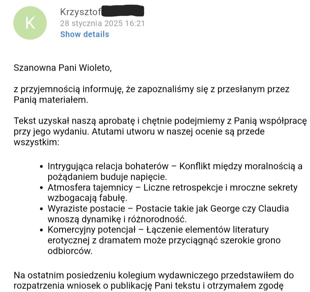 Zainspirowana tak dużym odzewem, autorka podjęła odważną decyzję: wyda książkę samodzielnie, wybierając model self-publishingu w ramach platformy Empik Selfpublishing (100% praw autorskich należy do autorki).