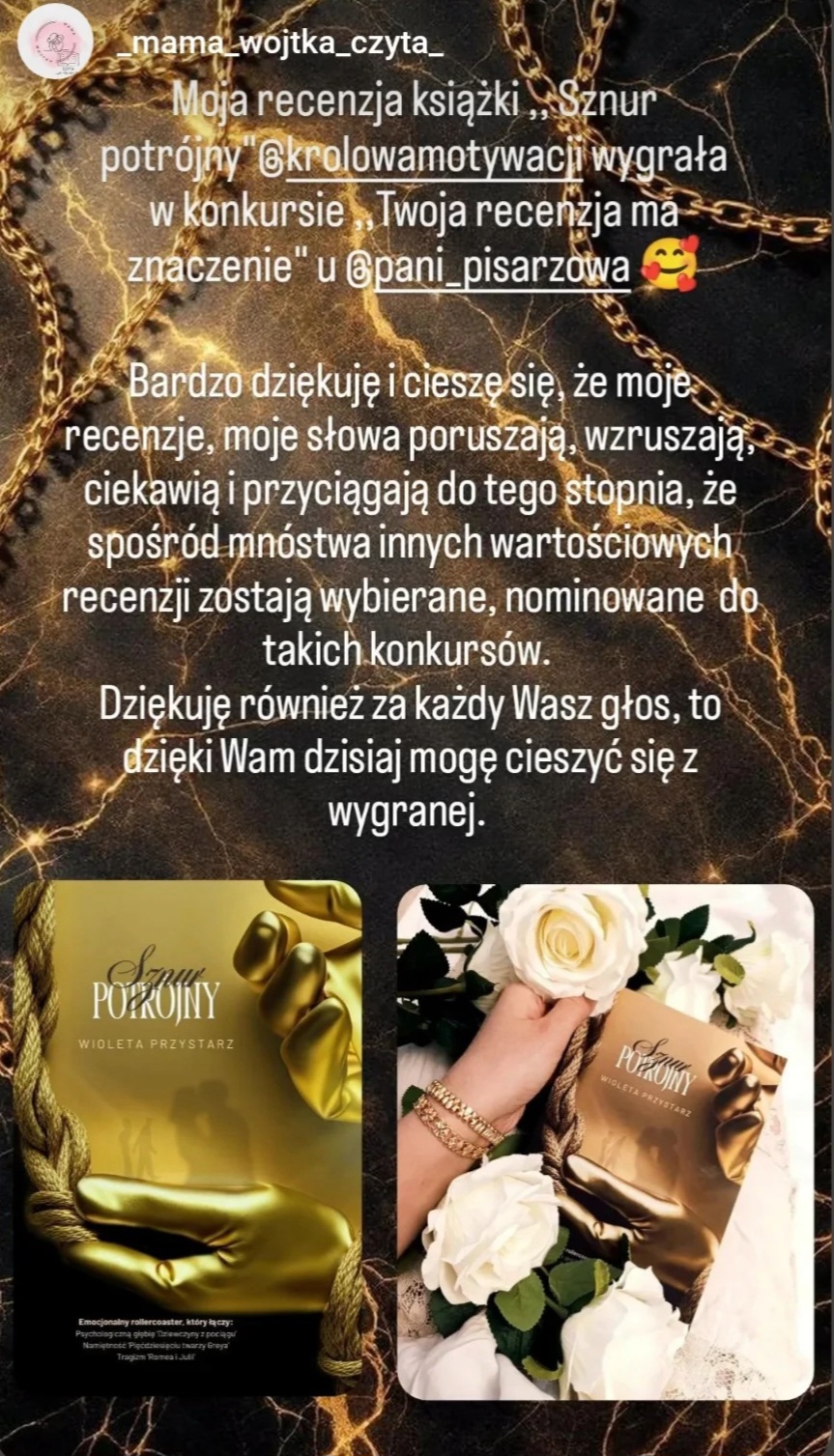 Jedna z profesjonalnych recenzentek wygrała konkurs „Twoja recenzja ma znaczenie”, zgłaszając do niego recenzję książki Sznur potrójny.