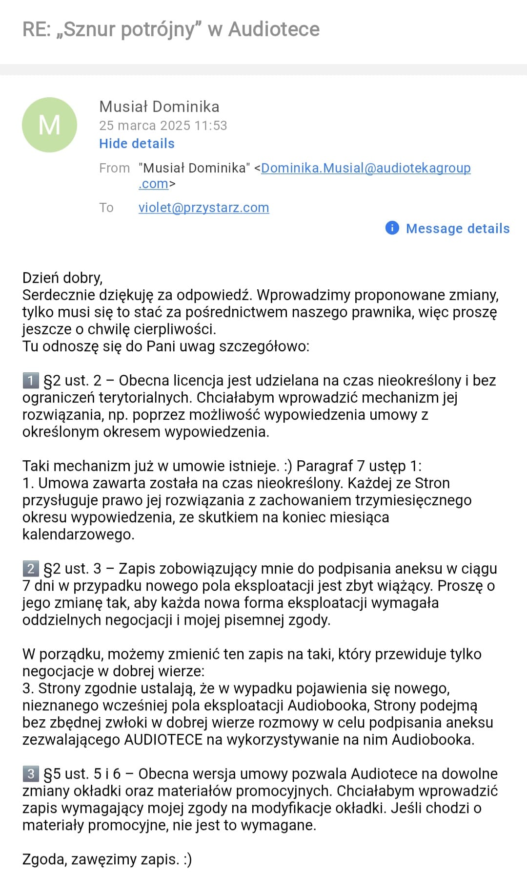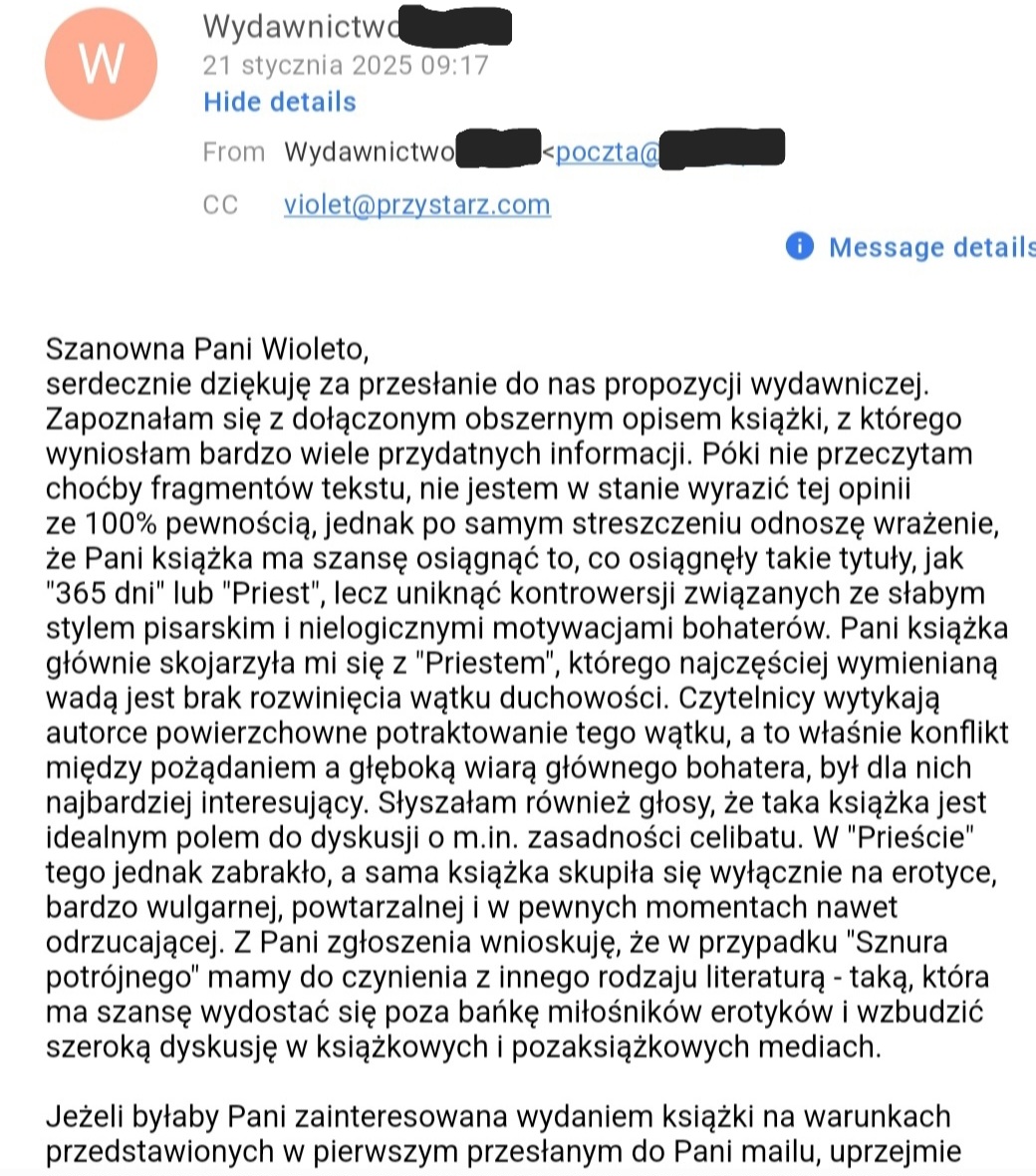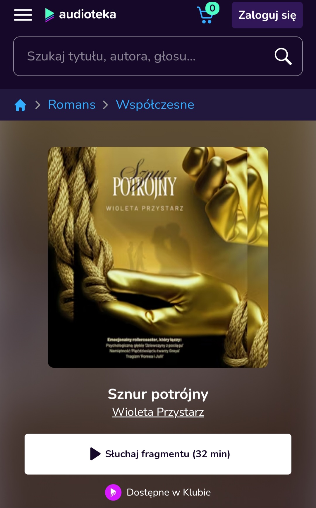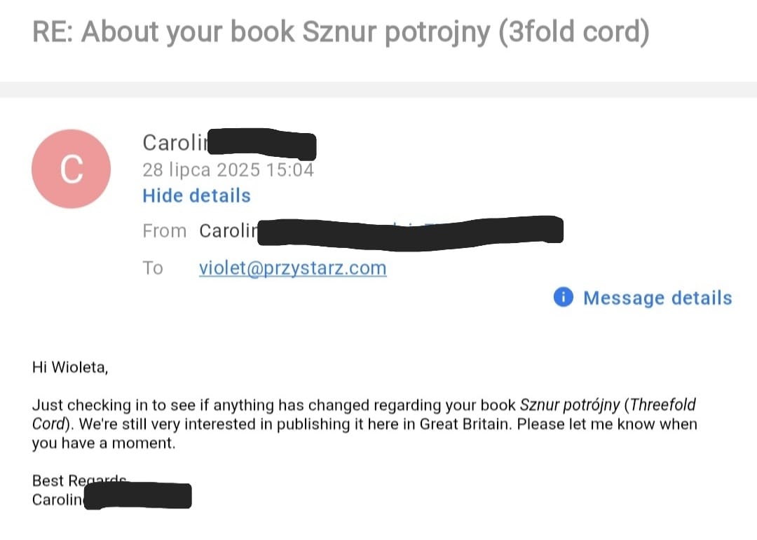 Jeśli są Państwo zainteresowani wydaniem powieści Sznur potrójny, proszę o kontakt pod adresem violet@przystarz.com lub telefonicznie pod numerem 799 871 940.