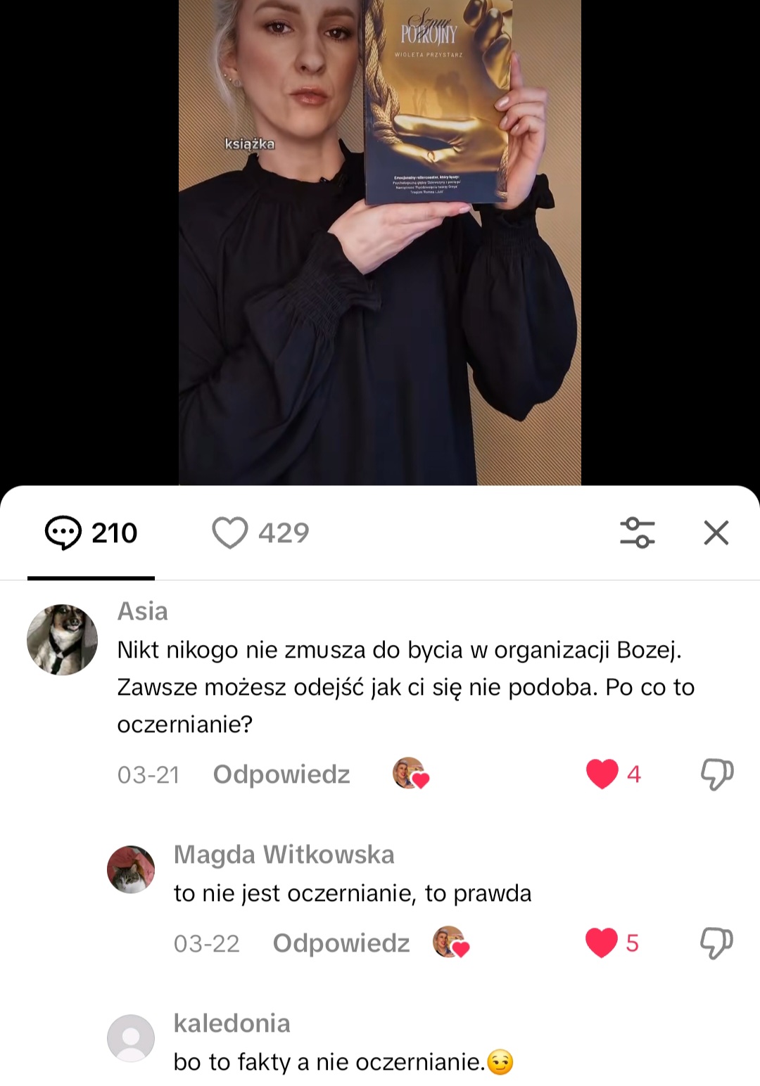 Ta szczerość ma swoją cenę. Autorka otrzymuje wiadomości z groźbami, wulgarnymi obelgami i naciskami, by usunęła książkę z obiegu. Padają słowa, że „zdechnie w Armagedonie”, że zdradziła Boga. Ci, którzy na co dzień głoszą miłość i pokój — gdy chodzi o obronę ich organizacji — potrafią zamienić się w bezwzględnych agresorów.
