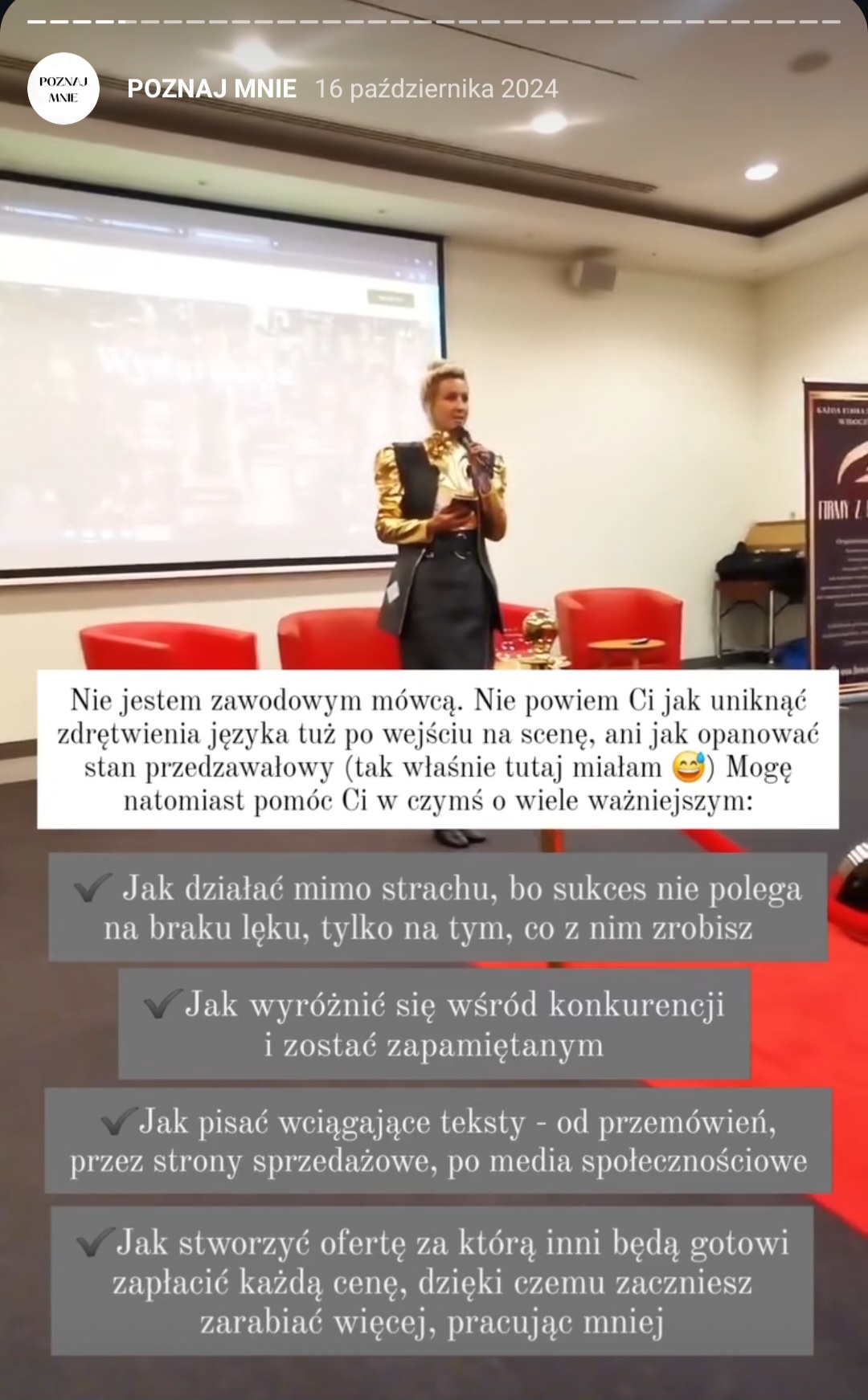 Autorka jest regularnie zapraszana jako prelegentka na prestiżowe konferencje motywacyjne i biznesowe, gdzie dzieli się swoją historią oraz wiedzą z zakresu psychologii, rozwoju osobistego oraz marketingu.